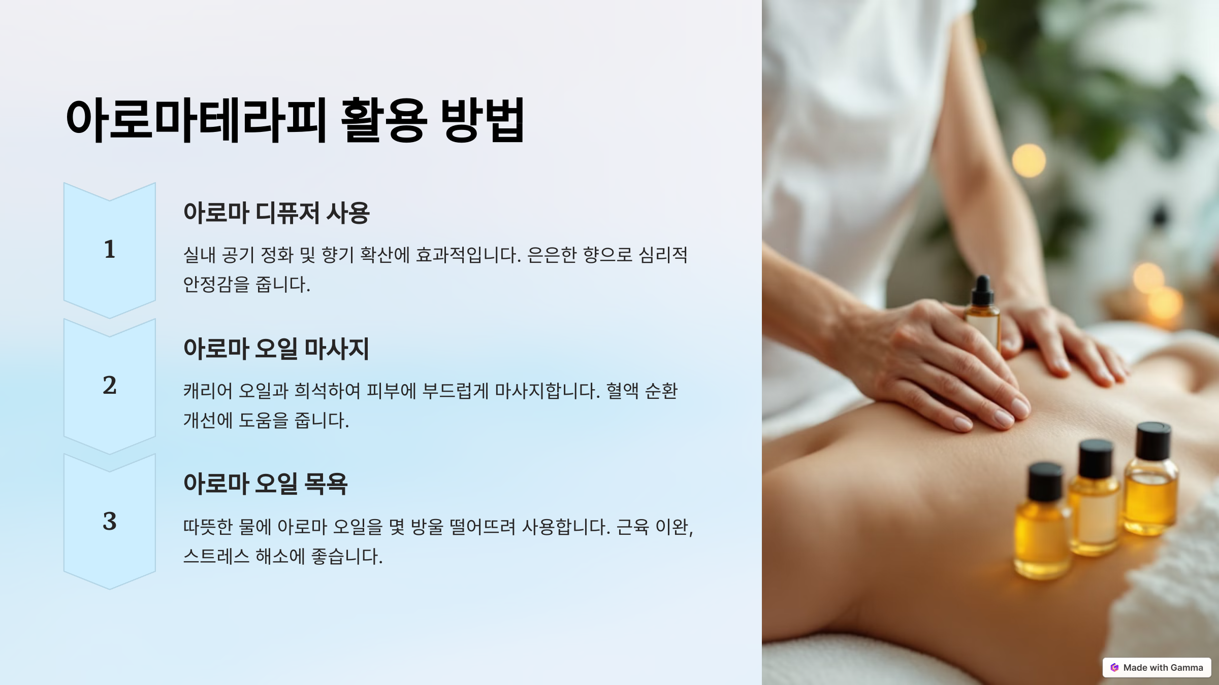 이제 이러한 아로마 오일을 어떻게 활용하면 좋을지 살펴볼게요! 😊
