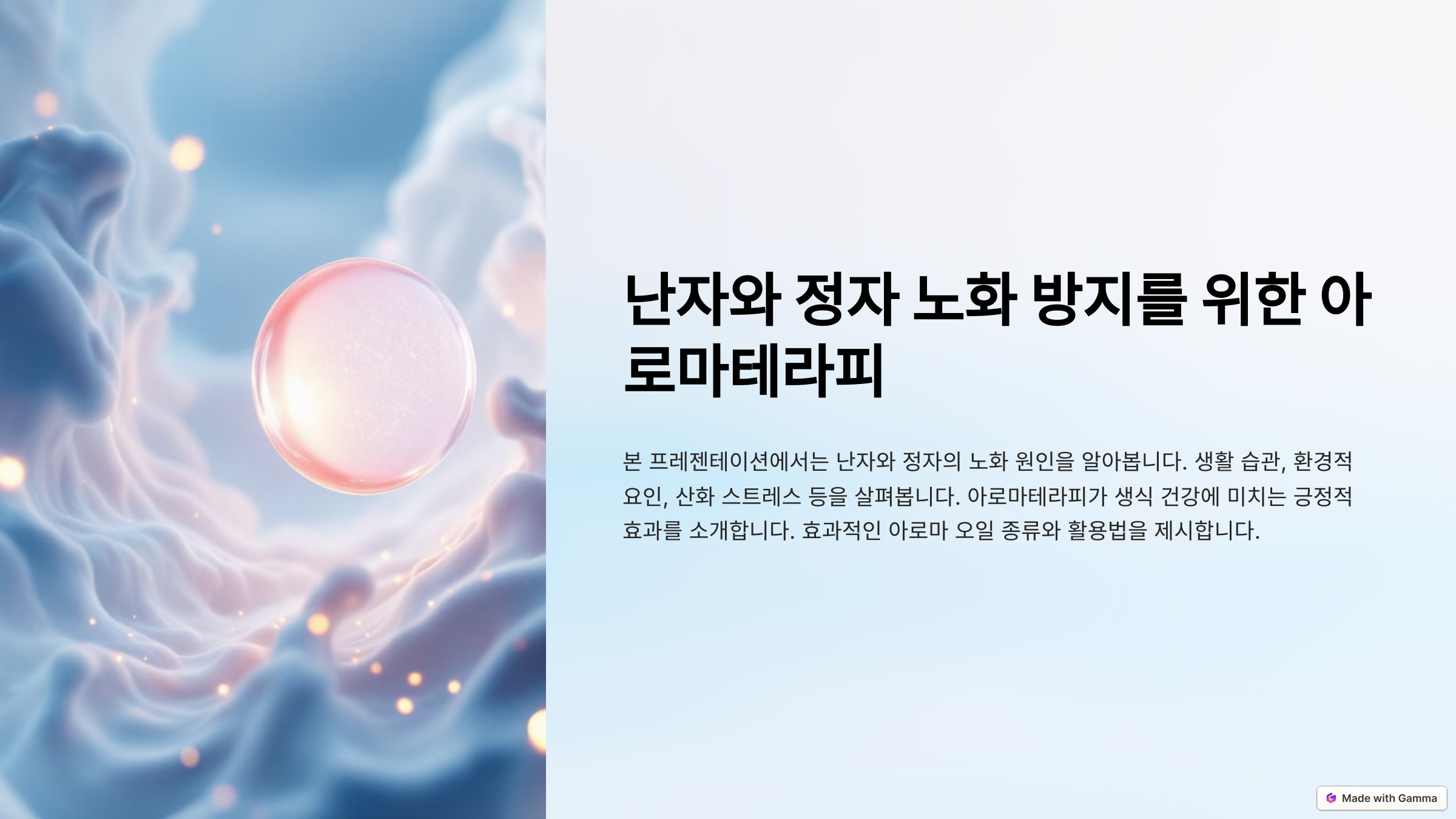 이처럼 난자와 정자는 여러 요인에 의해 노화될 수 있어요. 하지만 생활 습관을 개선하고, 항산화 물질을 섭취하며, 아로마테라피 같은 자연 요법을 활용하면 생식 세포의 건강을 보다 오래 유지할 수 있답니다! 🌱
