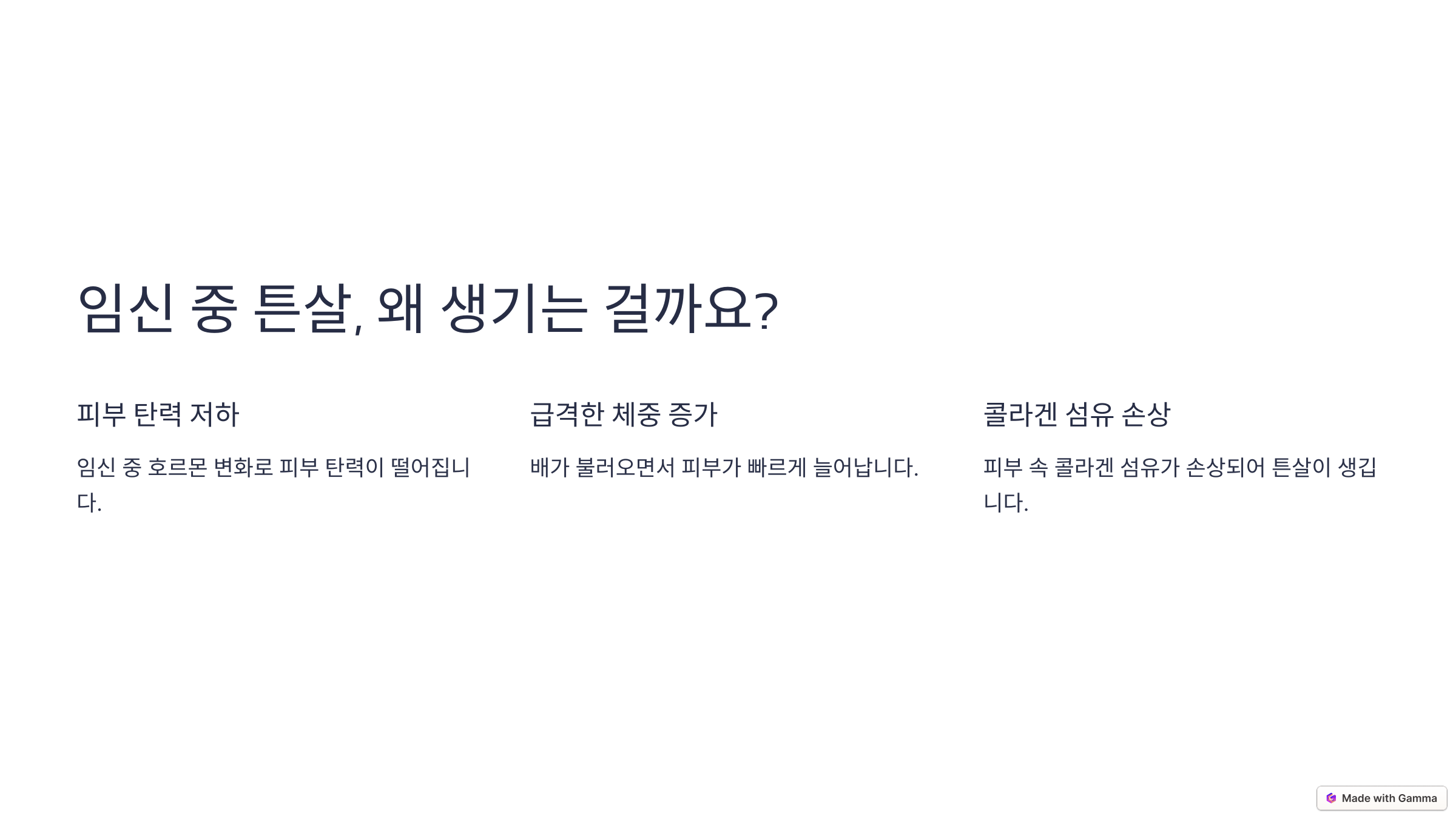 - 호르몬 변화: 임신 중 증가하는 호르몬이 피부의 콜라겐 생성을 방해하여 탄력이 떨어질 수 있어요.