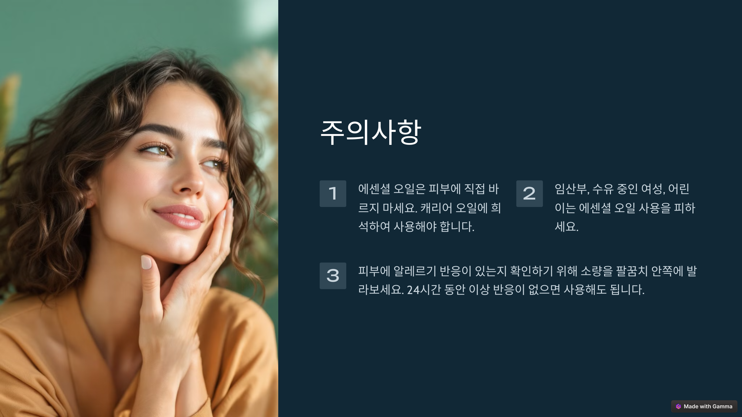 다음 섹션에서는 에센셜 오일 사용 시 주의해야 할 점을 알아볼게요! ⚠️
